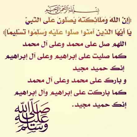 اللهم صل على محمد وعلى آل محمد كما صليت على إبراهيم وعلى آل إبراهيم إنك حميد مجيد، اللهم بارك على محمد وعلى آل محمد كما باركت على إبراهيم وعلى آل إبراهيم إنك حميد مجيد